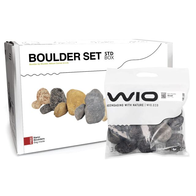 Die Stone Sets Druid Boulder von der Marke WIO bestehen aus einer Kombination unterschiedlicher gerundeter, dunkler Vulkansteine in Grau. Ihr strukturiertes und dunkles Aussehen macht sie perfekt für die Schaffung einer gealterten, urzeitlichen Atmosphäre. Der dunkle Farbton bietet einen interessanten Kontrast zu sattgrünen Wasserpflanzen und hellen Bodengrund.