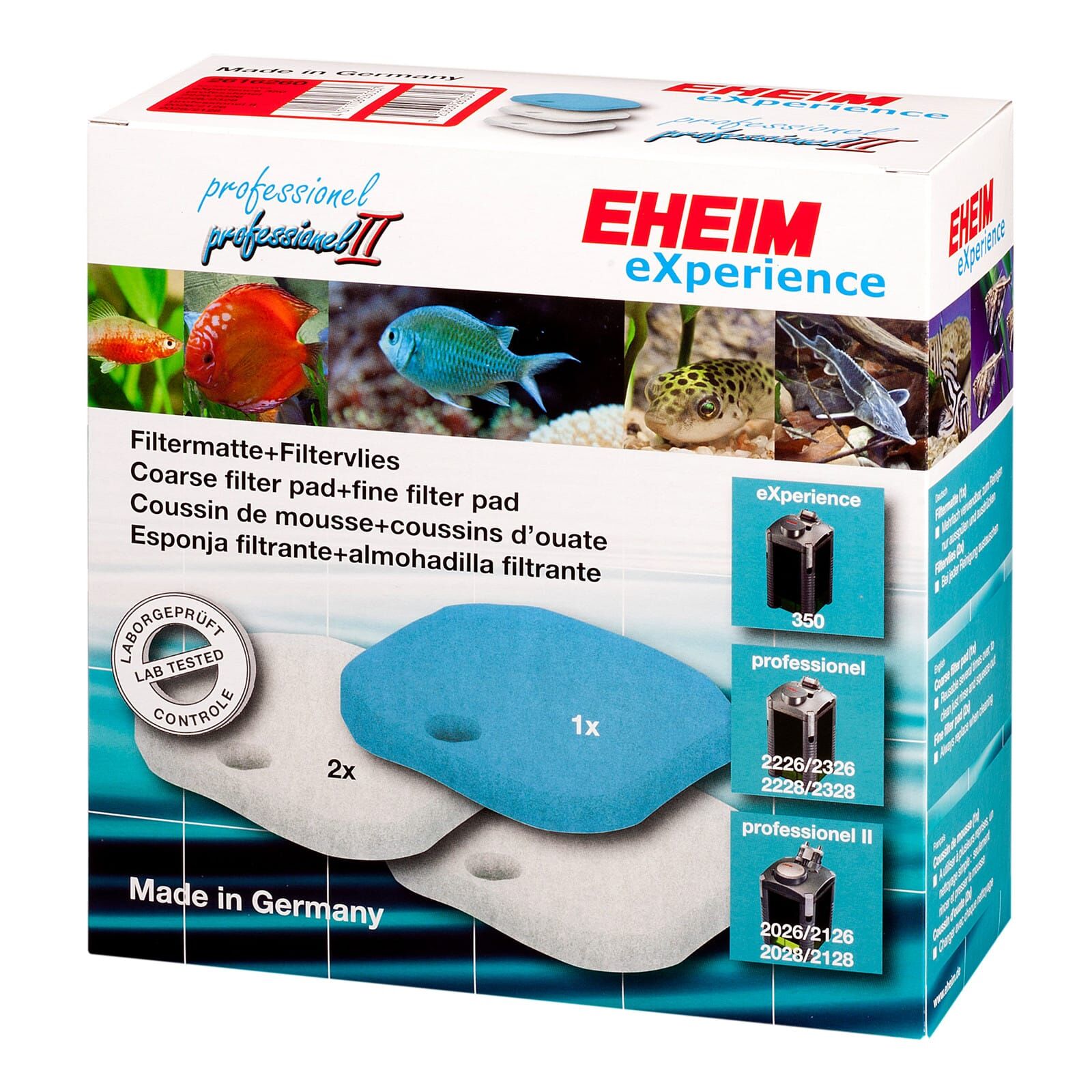 The sets for the EHEIM eXperience filter models contain 1 prefilter pad and 2 fine filter pads. The other models include 1 prefilter pad and 4 fine filter pads.