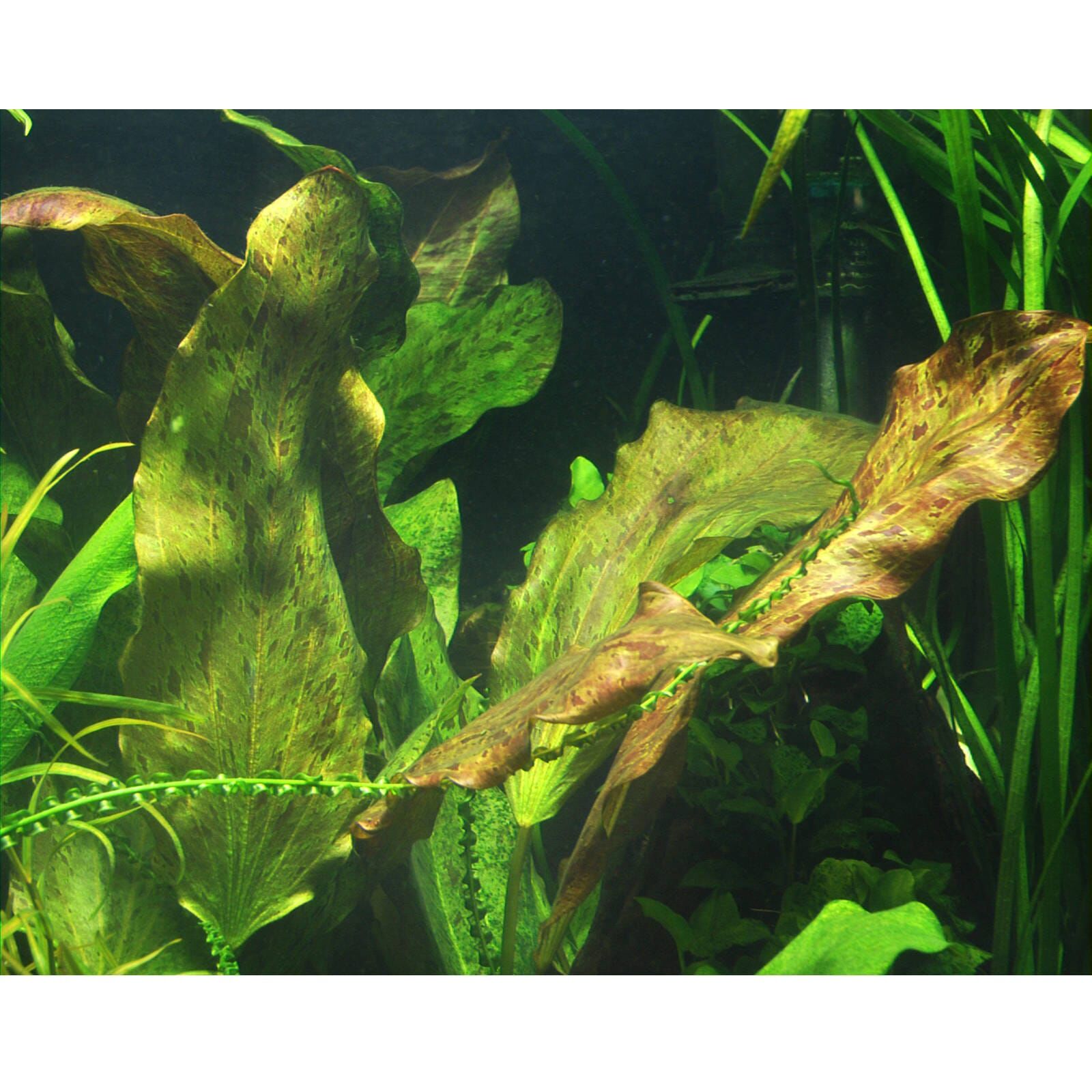 The Ozelot swordplant is a colourful, vigorously growing Echinodorus hybrid. It was bred by Hans Barth (Dessau, Germany) in the early 1990s and remains very popular in the aquarium hobby. Characteristic for this cultivar are narrowly elliptic submerged leaves that are brownish-red with dark red spots during sprouting. Older leaves keep their dark spot pattern but their basic colour changes to dark olive. The leaf rosette is about 20-50 cm tall and 20-40 cm wide.