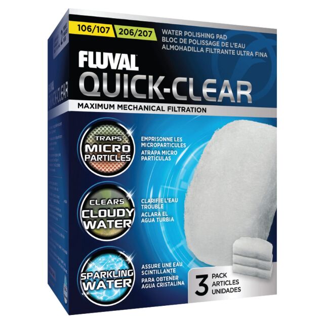 Fluval Quick-Clear is designed specifically for the Fluval 107/207 and 106/206 External Filters. These thick, ultra-fine polyester pads effectively trap micro-particles and impurities to provide crystal clear water in the aquarium.