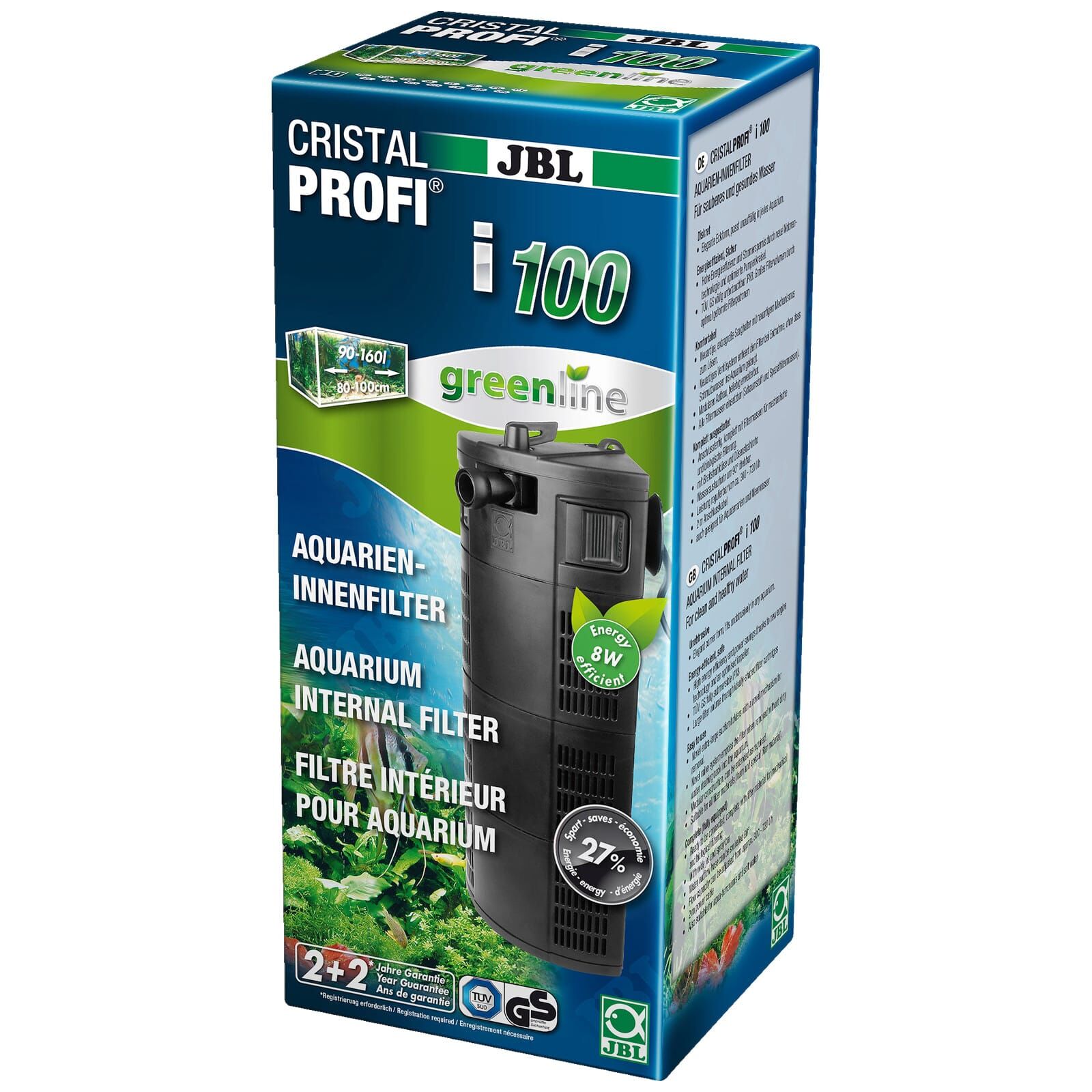 With the CristalProfi i series JBL provides compact and energy efficient internal filter for tanks from 40 l to 200 l. A maintenance-free pump built into the filter ensures permanent water circulation and can be adjusted in its flow from 150 to 720 l/h depending on the variation while consuming up to 63 % less power than comparable models.