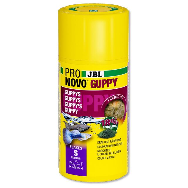 JBL ProNovo Guppy Flakes S is a prebiotic, floating aquarium main feed in size S for guppies and other livebearers from 3 to 10 cm.