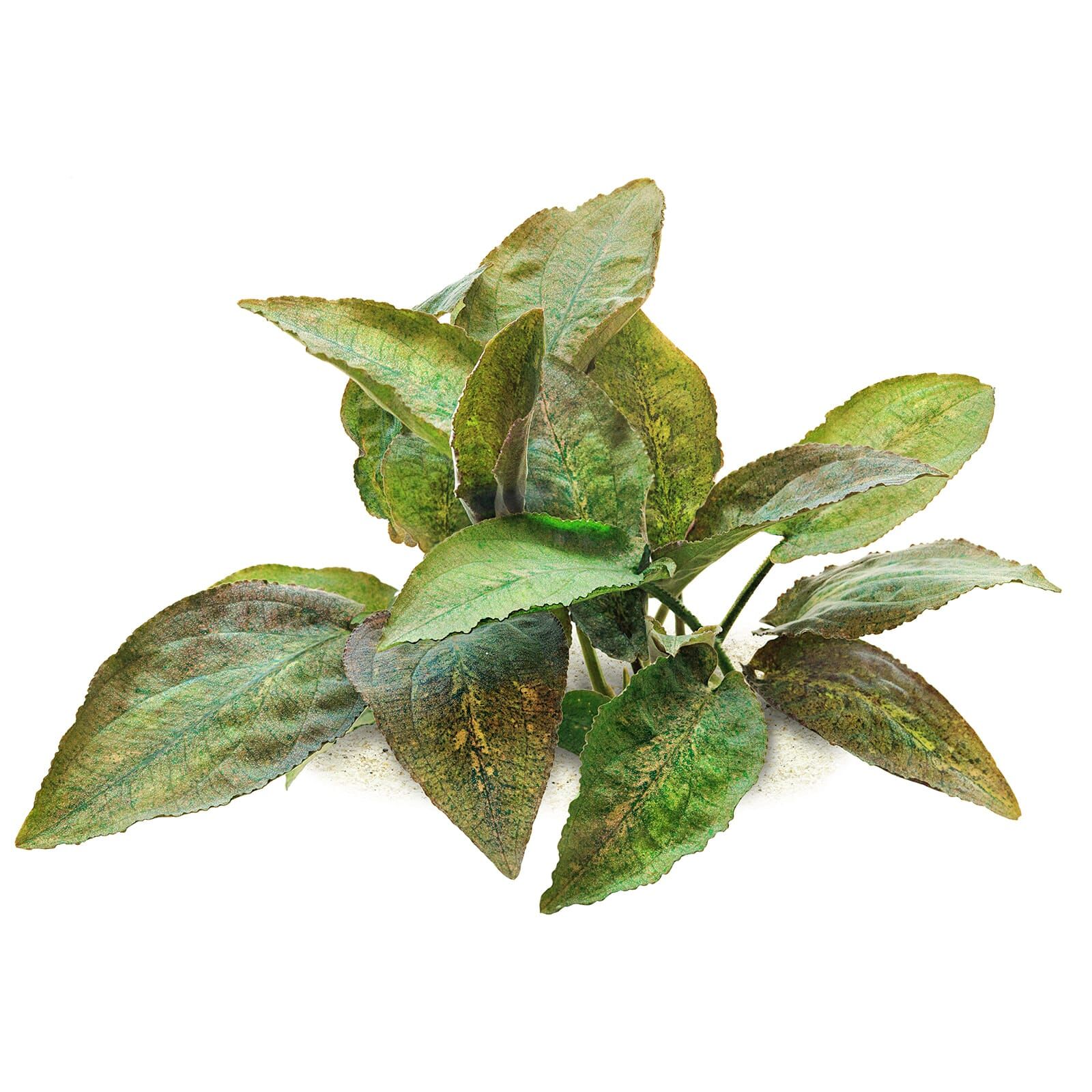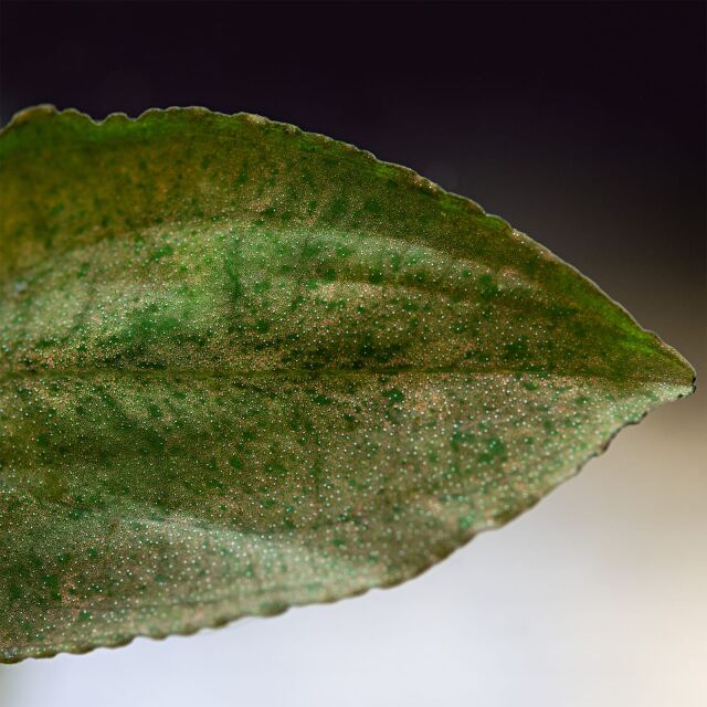 Lagenandra keralensis is a remarkable species from Kerala state in southwestern India that was scientifically described in 2001. It was until recently not at all known from cultivation, but surprisingly it is offered as tissue-cultured (in-vitro) plant by the Japanese company ADA. This species is not to be confused with an aquarium plant that is erroneously called "Lagenandra keralensis" and turned out as a narrow-leaved Lagenandra meeboldii form (see Lagenandra meeboldii "Kerala"). The true Lagenandra keralensis resembles broad-leaved forms of L. meeboldii but differs mainly in inflorescence features. The ovate leaves, sitting on a creeping rhizome, show brown tones. They have a finely ruffled margin and are covered with short hairs. According to the original species description, the leaf blades are 2,7-7 cm and the leaf stalks 2-7 cm long.
