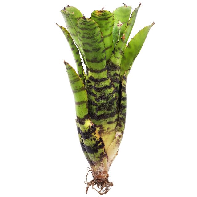 Neoregelia 'Eteria' is characterised by its striking, horizontally striped, rosette-shaped leaves. The leaves are lance-shaped and round off at the end, forming a small point. The plant is particularly suitable for terrariums, as it is not only visually appealing but also capable of improving the microclimate. Its flowers are small and inconspicuous, appearing in the centre of the rosette and often surrounded by brightly coloured bracts indicating the flowering period. Neoregelia 'Eteria' is ideal as a focal point or in group plantings and can be easily propagated by pups that appear after flowering.