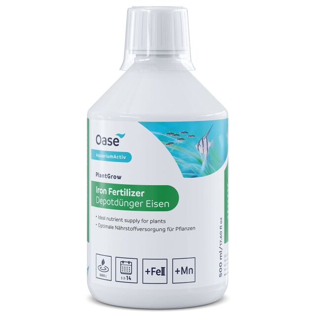 The Depot Fertiliser Fe from Oase contains all the necessary supplementary nutrients for plants and adds important iron to the aquarium. Iron and manganese support healthy and strong growth of aquatic plants. The Depot Fertiliser is available in 100 ml, 250 ml and 500 ml containers. The Depot Fertiliser Fe can also be used as a system fertiliser with the PlantGrow Weekly Fertiliser and PlantGrow Daily Fertiliser from Oase.