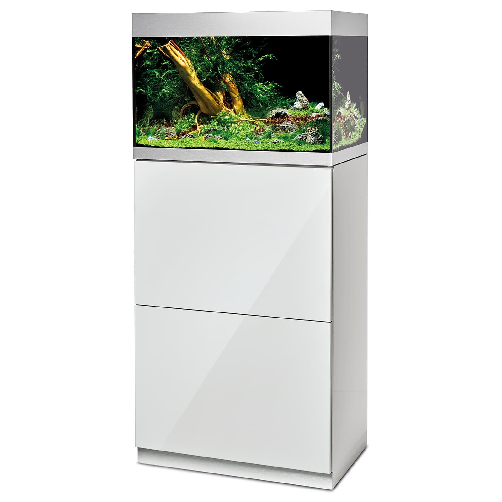 The aquarium made of white glass has a cover with which a separately available lighting is concealed.