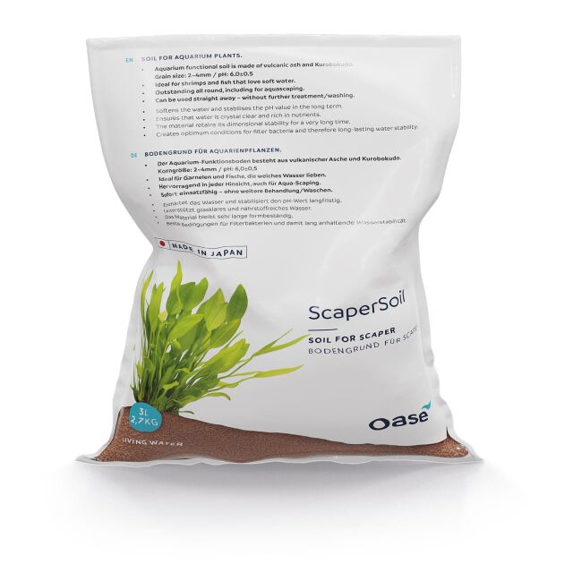 Oase ScaperLine Soil brown is a moist and dimensionally stable soil material from Japan. It lowers the carbonate hardness and stabilises the pH-value in the aquarium in the long term. It also promotes the growth of plants in the aquarium. The soil material consists of grains with a diameter of 1.5 to 3 mm. Oase ScaperLine Soil is available in brown and black, in 3 l or 9 l bags.