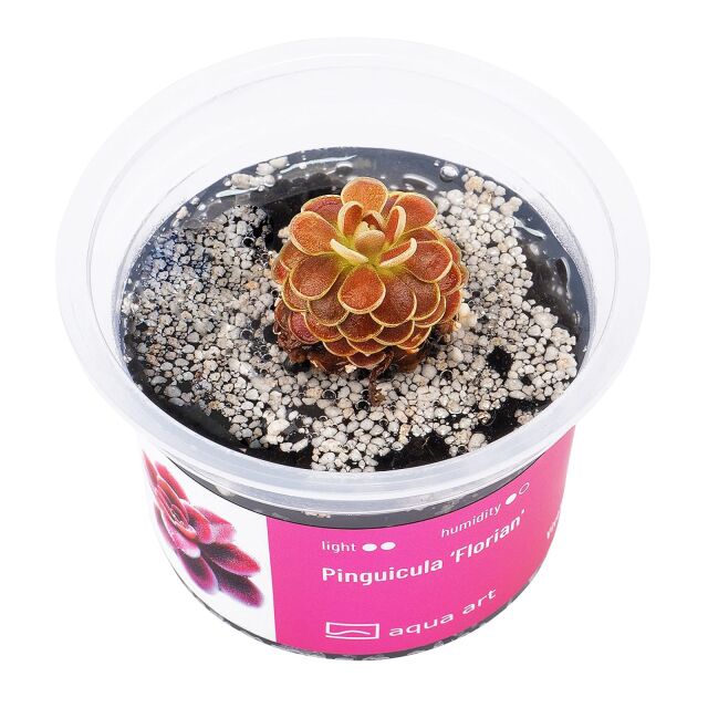 Pinguicula 'Florian' is ideal for keeping in terrariums as the controlled environment provides optimal growth conditions. With a diameter of up to 1 cm, it fits well in smaller terrariums. The leaves of this plant can take on an intense red hue under strong light, making it a visual highlight. During the insect-feeding phase, Pinguicula 'Florian' feeds on small insects, which helps keep the terrarium clean. The plant forms a smaller succulent rosette throughout the year, highlighting its unique adaptability and beauty.