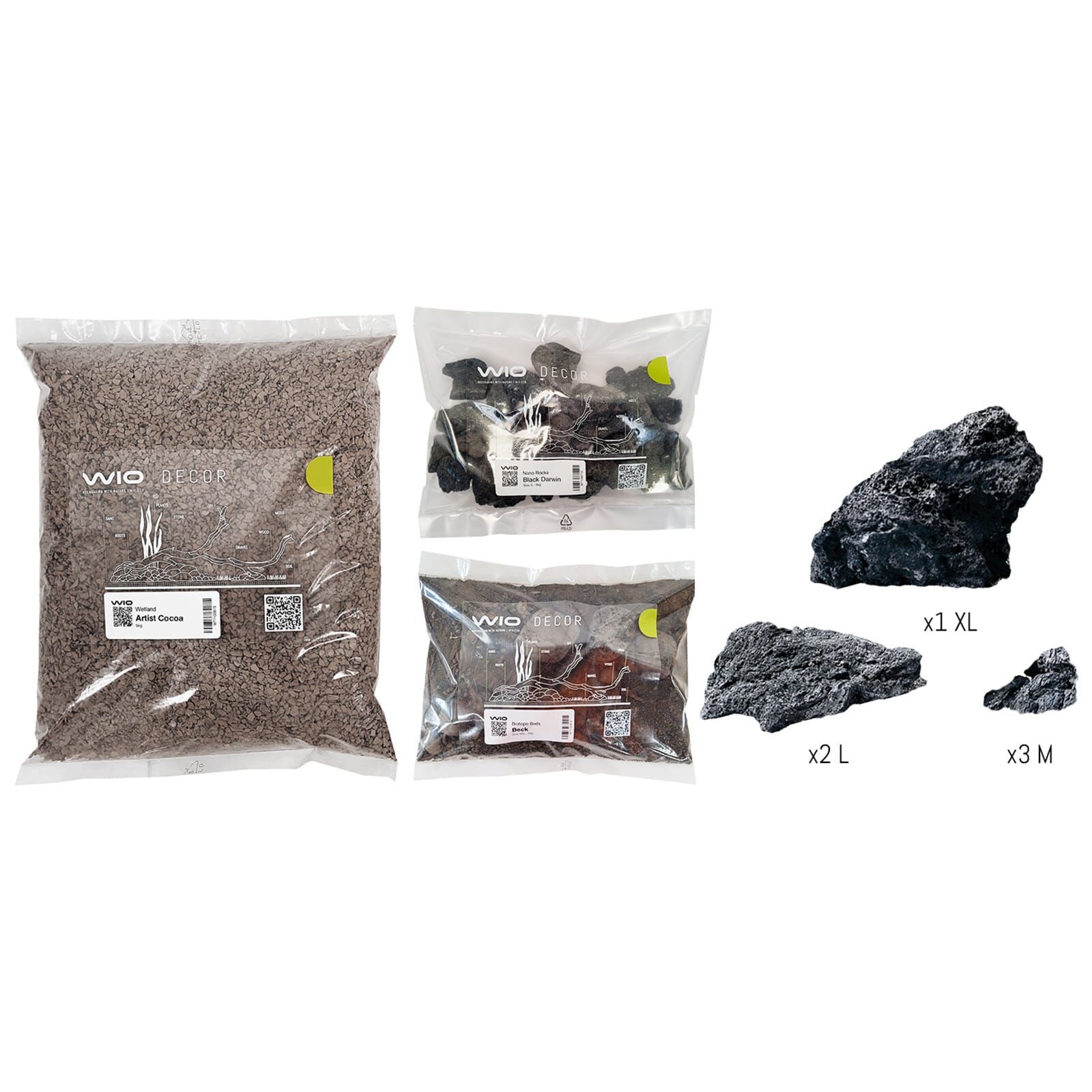 The Beck Kit aims to create a scene with impact and authentic natural vibe. It contains contains stones of light to dark grey, mixed with strips of bark, twigs, and crushed leaves along with shells in different subtle shades or showing bright white spots. All this is placed together with dark grey, textured volcanic sand from the mountains of Catalonia. The angular aesthetic of the Darwin Black lava stone with its grey to black colouring creates a moody ambience. When contrasted with bright green plants, WIO Biotope Decor Kit Beck brings original and inspiring opportunities for the nature artist and their imagination. Naturally, the scope of delivery includes the dark, rich-brown coloured Wetland Artist Cocoa substrate, ideal for supporting lush plant growth, with dark colouration complementing the rest of the display.