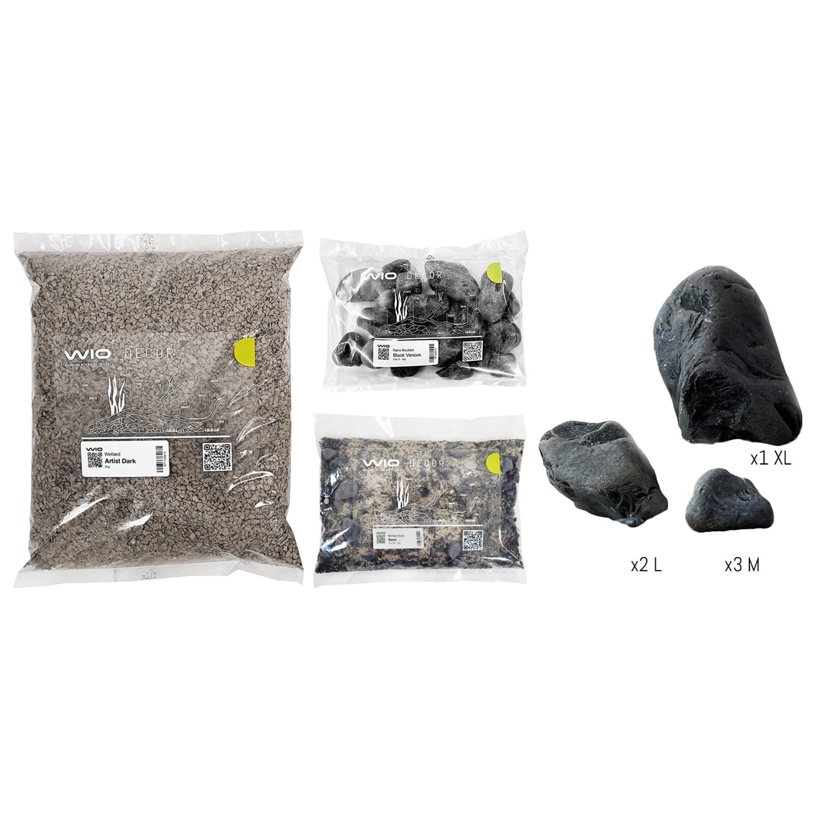 Das Ibon Kit zielt darauf ab, eine Landschaft mit authentischer natürlicher Ausstrahlung zu schaffen. Es enthält hellen Sand, gemischt mit kleinen dunklen, glatten Steinen, die einen starken Kontrast bilden. Außerdem sind verschiedene Größen der WIO Decor Black Venom Boulders enthalten, deren dunkle, solide Formen in der Anlage einen starken Charakter haben. Wenn sie nass sind, glitzern und glänzen alle Steine in diesem Set wunderschön und werden dunkler, was einen starken Kontrast zu den grünen Pflanzen bildet und ein stimmungsvolles Ambiente erzeugt. Zum Lieferumfang gehört natürlich auch das WIO Decor Wetland Artist Dark Substrat, das sich ideal für ein üppiges Pflanzenwachstum eignet.