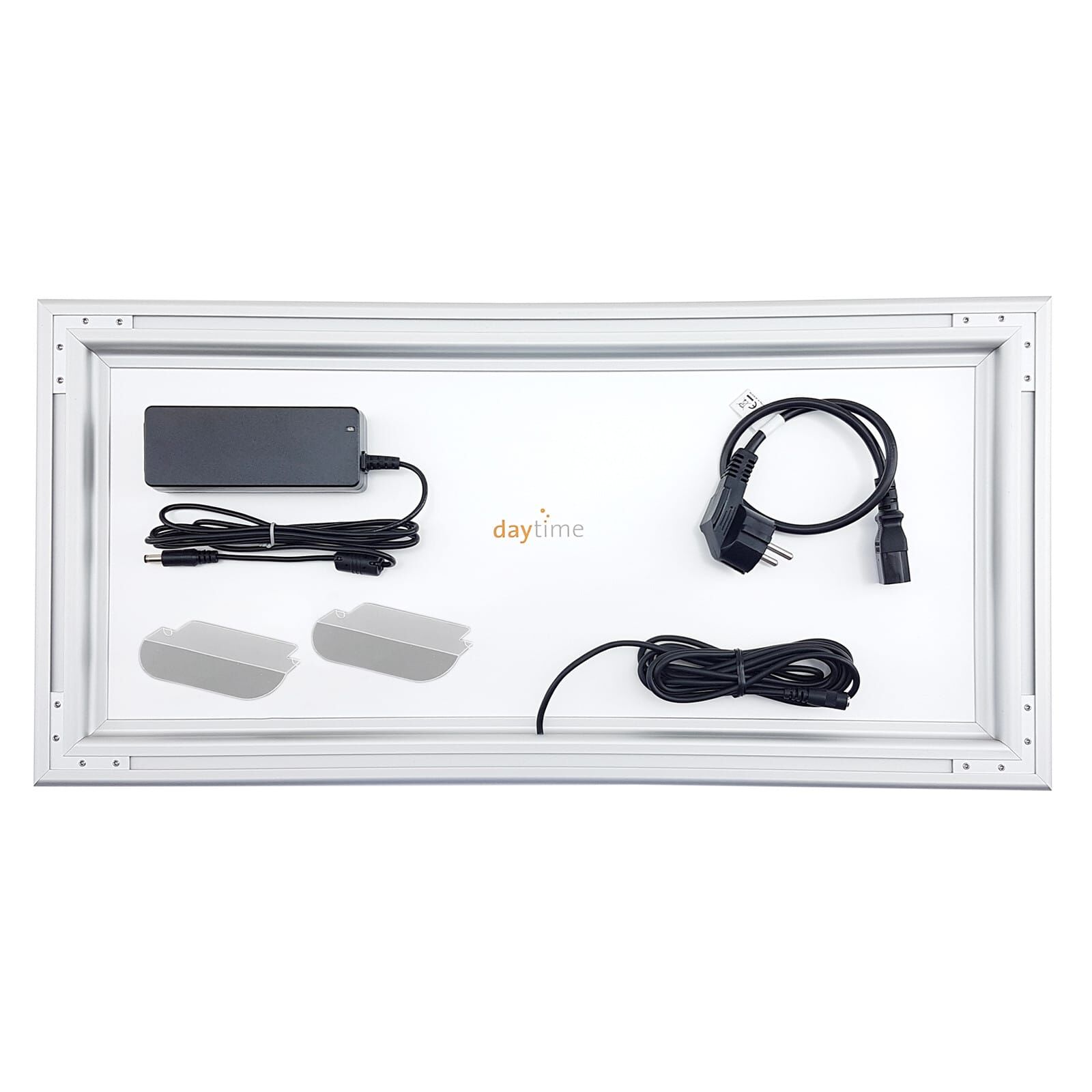 The installation on the aquarium is realised with the polycarbonate retaining clips included in the scope of delivery. The frame of the panel has a circumferential aluminium rib, which makes installation very easy. The clips are inserted on the right and left between the glass and the gravel screen of the aquarium, the backlight Panel is then placed on the clips and snapped into place. The spring tension of the clips keeps the daytime backlight in position.